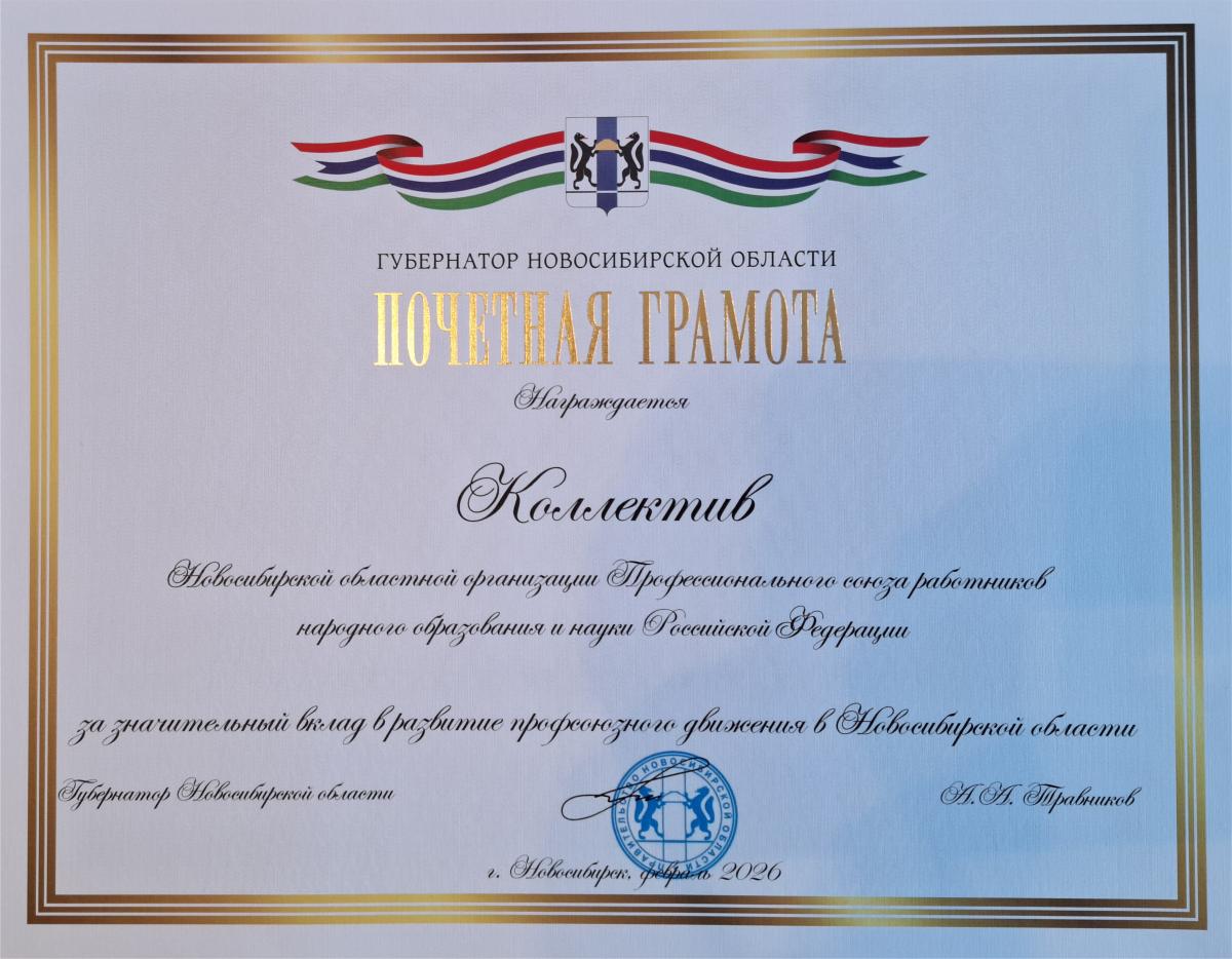 Почетной грамотой Губернатора Новосибирской области была отмечена Новосибирская областная организация Общероссийского Профсоюза образования.